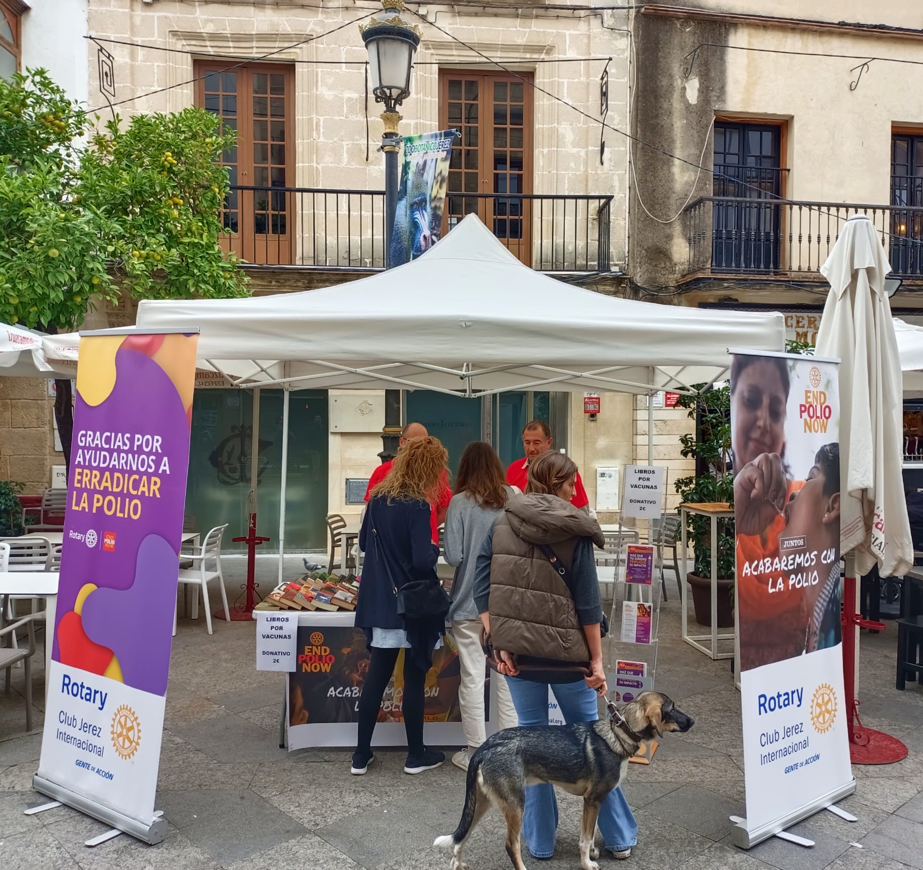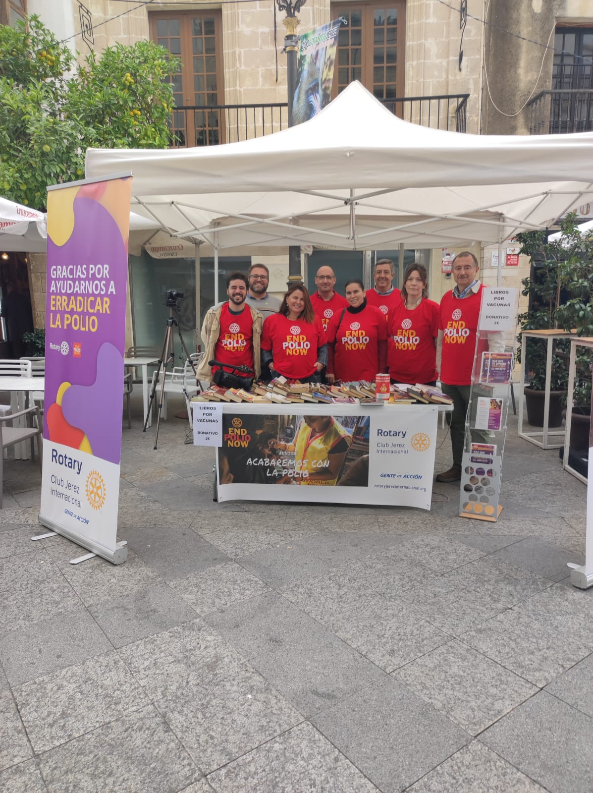 Esta acción la hemos llevado a cabo con la instalación de una carpa en pleno centro de Jerez donde hemos ofrecido libros a cambio de una donación. Los libros fueron proporcionados generosamente por nuestro compañero José Manuel Fernández. Con la entrega de estos libros hemos conseguido varios objetivos, obtenemos fondos para la lucha contra la Polio, damos una segunda vida a los libros entregados a cambio de la donación. Durante prácticamente todo el día la mayoría de socios de nuestro club atendieron esta carpa dispuestos a informar sobre lo que Rotary hace en el mundo en su lucha contra la Polio en alianza con otras organizaciones como la OMS, UNICEF, el CDC de Estados Unidos y la Fundación de Bill y Melinda Gates.