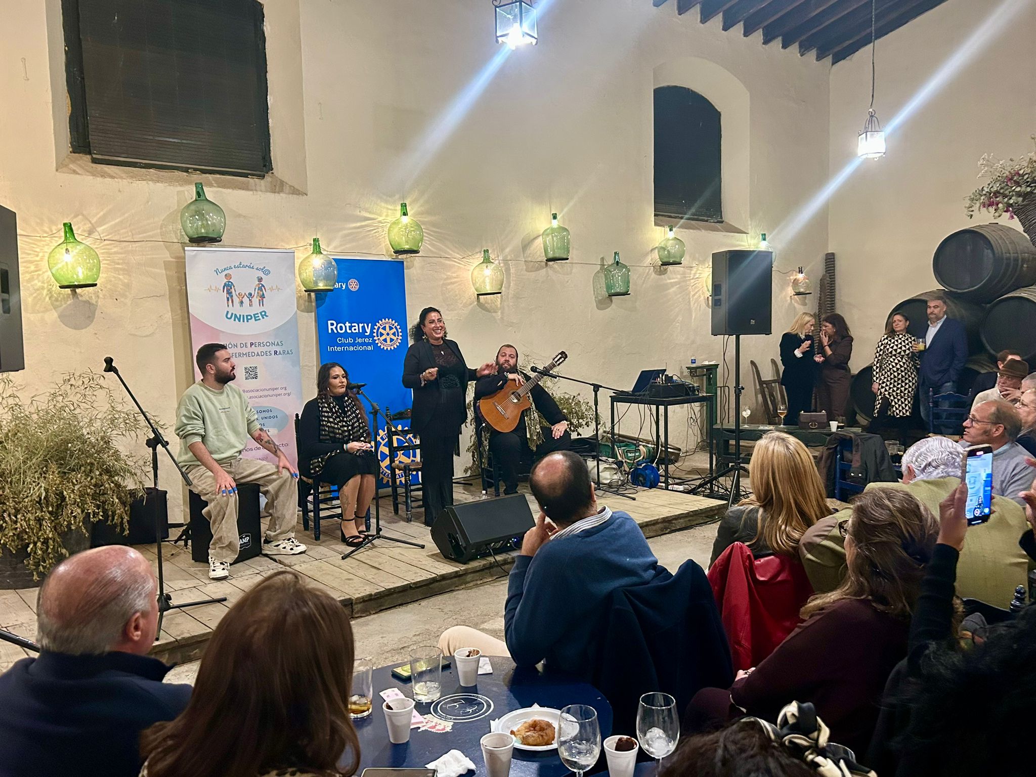 Hasta Jerez se desplazaron rotarios de otros clubs amigos de Castelldefels, Valencia, Sevilla, Málaga, Cambridge creando un extraordinario ambiente en el que se disfrutó de una estupenda comida y la actuación de Eva del Cristo y el grupo A Nuestro Aire.