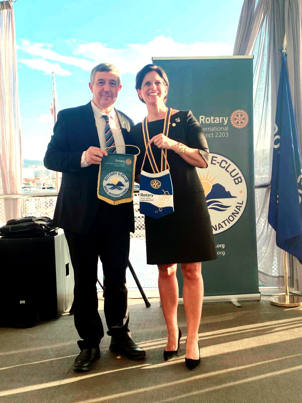 El pasado 7 de Noviembre nuestro compañero Esteban Fernández, socio fundador y primer presidente del Rotary Club Jerez Internacional, acudió al acto de constitución del nuevo Rotary e-Club Ibiza internacional celebrado en el Club Náutico de la isla. En el acto Esteban como embajador de nuestro Club hizo el tradicional intercambio de banderines con Denise Klischan presidenta fundadora de este nuevo Club.